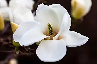 Magnolia × soulangeana (Magnolia denudata × Magnolia liliiflora), the saucer magnolia or sometimes the tulip tree,[1][2][a] is a hybrid flowering plant in the genus Magnolia and family Magnoliaceae. It is a deciduous tree with large, early-blooming flowers in various shades of white, pink, and purple. It is one of the most commonly used magnolias in horticulture, being widely planted in the British Isles, especially in the south of England; and in the United States, especially the east and west coasts.[3]