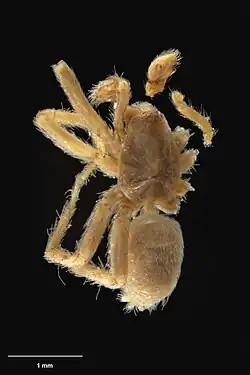 The male is recorded at 2.52mm in length whereas the female is 2.89mm. The cephalothorax and legs are pale reddish brown. The abdomen is creamy with grey shading.[1]
