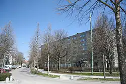 In the street, house numbers 11-13 were formerly barrack buildings.[1] At Maillingerstraße 11, a three-story extension was built in 1979 for the payment agency for Bavarian state employees.[2] Since 1968, the offices of the Bavarian State Office of Criminal Investigation have been located on the street, on the site of the artillery barracks,[1][3] in which a part of the listed former barracks building at Maillingerstraße 15 was integrated. This building and five other four- to five-storey apartment buildings in Maillingerstraße are historically listed buildings.[4] They refer to