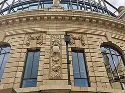 The Majestic is a two-storey building in the Beaux-Arts style clad in Marmo artificial marble, a glazed terracotta which was made by the Leeds Fireclay Co at Burmantofts. Until restoration, this white material was blackened for many years by the polluted environment of Leeds.[4] It is sited on the corner of Wellington Street and Quebec Street, with a curved and decorative entrance facade facing City Square. It originally had steep slate mansard roofs with dormers and a 10 m (33 ft) dome, but these were lost to the fire of 2014. Though the style is reserved compared to previous Edwardian or Victorian buildings, there are many subtle external decorative features. These principally include the Greek key patterned panels on both side elevations, the cornice with modillions, vase balustrade and two sets of triple bull's-eye windows at the attic storey. On the first floor, there are moulded faience swags above windows and detailed panels illustrating musical instruments.[3]