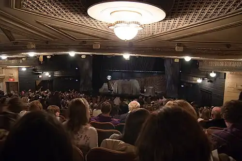 The orchestra's rear (west) end contains a shallow promenade with doors on either end.[33] The orchestra is raked, but the rear rows contain stadium seating that is more steeply sloped than the front rows. The rearmost row is actually at the mezzanine level above the entrance foyer.[26][28] Halfway through the auditorium's length are exit doors on either side, connected by a wide aisle that separates the front and rear rows.[33] The orchestra and its promenade contain walls with alternating molded and flower/urn panels. Above the paneling, and around the exit signs above the side doors, are moldings with vine decorations.[37] There are brass wall sconces on the orchestra walls. The rearmost row in the orchestra's rear section has a decorative iron rail behind it, and another iron railing wraps around the front and sides.[34] The front of the orchestra contains rusticated wall surfaces with rectangular openings, which contain staircases to the boxes.[32]