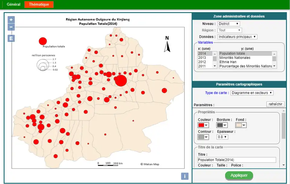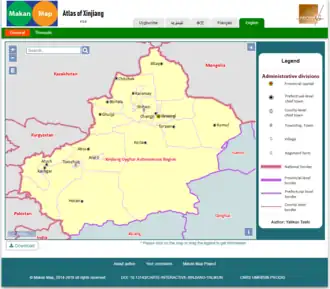 The Makan Map is an online interactive atlas of the Xinjiang Uyghur Autonomous Region of China.[1][2][3][4] This region covers an area of 1,664,897 km2, or 16% of China's territory. It allows to visualize geographic, administrative and socio-economic baseline data, to carry out statistical analysis and to create thematic maps for this region.[5] The Makan Map is the first multi-language atlas of the Xinjiang.[6] It has been created in four languages: Uyghur, Chinese, French and English. The current version is the second version of the Makan Map.[1] Development is ongoing for future releases.[6]