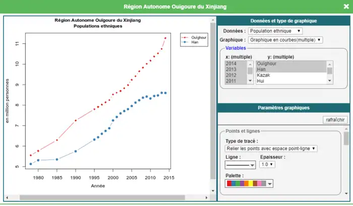 Four types of map are possible: choropleth, pie plot, dot-density map and bar plots. The cartographic choices are imposed to the user and can't derogate from graphic semiology. 43 themes are available for the years from 1949 to 2014. Users produce thematic maps interactively based on selected themes and map settings.
