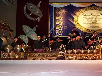 Malay gamelan was first introduced to the public when Tan Sri Mubin Sheppard, a Malay architectural scholar, found a gamelan set at the Pool Terengganu Palace and then asked Tengku Ampuan Mariam's permission to turn on this gamelan in 1966.[14] The first appearance of the Gamelan Orchestra in Raja Terengganu was in 1969 at the Asian Music and Drama Festival at Universiti Malaya (UM) Kuala Lumpur followed in 1970 in conjunction with Temasha Seni Melayu which also presented a new generation of dancers. Since then, it has become a part of the Malaysian arts and cultural heritage. Gamelan is commonly played during formal occasions like weddings and traditional ceremonies.