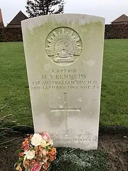 - ^ Captain Malcolm Stuart Kennedy, (Dranoutre Military Cemetery), Commonwealth War Graves Commission.