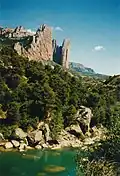 The Mallos de Riglos (English: Mallets of Riglos)[1] are a set of conglomerate rock formations, located in the municipality of Las Peñas de Riglos, in the Hoya de Huesca comarca, in Aragon, Spain. They are located near Las Peñas de Riglos some 45 km (28 mi) to the northwest of the city of Huesca. Rising to some 300 metres (980 ft) high (c. 1000 metres or 3,300 ft (1,000 m) above sea level), they form part of the foothills of the Pyrenees.[1]