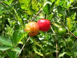 Malpighia is a genus of flowering plants in the nance family, Malpighiaceae. It contains 108 species of shrubs or small trees, all of which are native to the American tropics, ranging from Texas through Mexico, Central America, and the Caribbean to Venezuela, Colombia, and Ecuador.[1][3] The generic name honours Marcello Malpighi, a 17th-century Italian physician and botanist.[4] The species grow to 1–6 m (3.3–19.7 ft) tall, with a dense, often thorny crown. The leaves are evergreen, simple, 0.5–15 cm (0.20–5.91 in) long, with an entire or serrated margin. The flowers are solitary or in umbels of two to several together, each flower 1–2 cm (0.39–0.79 in) diameter, with five white, pink, red, or purple petals. The fruit is a red, orange, or purple drupe, containing two or three hard seeds. M. emarginata, the acerola, is cultivated for its sweet and juicy fruits, which are very rich in vitamin C.[5]