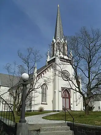 Mamaroneck United Methodist Church is a historic Methodist church located at 546 East Boston Post Road in Mamaroneck, Westchester County, New York. It was built in 1859 and is a one-story, Gothic Revival style building of wood-frame construction with a gable roof. It is rectangular in form with a rear, two story, transecting wing built in 1869. It features a semi-engaged central tower flanked by stylized buttresses and topped by an octagonal spire.[2]