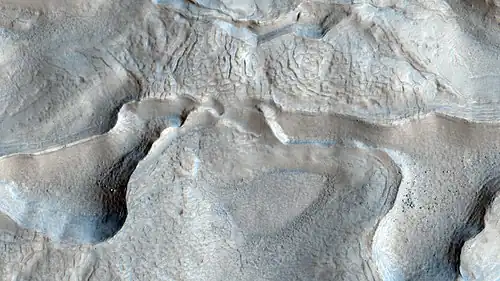 Glacial-like flow features near the Mamers Valles. Scarps and hills appear twisted like taffy, probably the result of the slow movement of the subsurface ice. Note the patterned ground at top center. These small-scale textures may be the result of sublimation (evaporation) of subsurface ice combined with the taffy-like shifts in the ground surface. Width of image is about a kilometer.