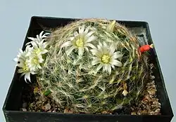 Its flowers are white and in a "crown" like other Mammillaria species.[3]