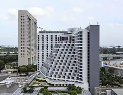 The hotel's 527 rooms and suites overlook the Singapore city skyline.[6] US Architect John Portman designed the atrium-style hotel based on a theatre concept and intended the exterior of the structure to resemble a fan, a nod to the Mandarin Oriental logo.[7][8]