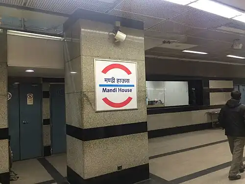 The Mandi House metro station is an interchange station between the Blue Line and Violet Line of Delhi Metro.[1] It services the cultural hub of Delhi, Mandi House, that hosts the National School of Drama, Ravindra Bhavan (home of Sangeet Natak Akademi and Sahitya Akademi), Shri Ram Centre for Performing Arts, and Triveni Kala Sangam. Bengali Market is located in the vicinity as well.