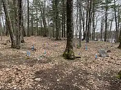 There are around 160 burials, most in unmarked graves. Dozens of blue plastic markers denote what are believed to be burials.[1] The Mann family plot is surrounded by barbed wire, outside of which members of at least ten other families are buried.[1]