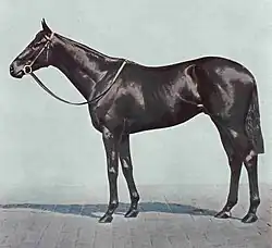 Manna, described by the Breeders’ Review as "a superb creature" with whom it was "impossible to find fault",[1] was a bay horse bred in Ireland by James J. Maher at his Confey Stud in County Kildare. As a yearling he was sent to the sales at Doncaster, where he was sold for 6,300 gns to the trainer Fred Darling acting on behalf of the Shanghai-based bullion broker Henry E. Morriss. Darling had been instructed by a telegram from Morriss to buy the best yearling in the sale.[2] Manna was trained by Darling at his stable at Beckhampton in Wiltshire[3] where he proved to be a lively and high-spirited individual.[4]