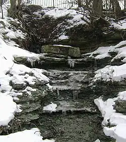 Waubonsie Creek in Oswego, Illinois. The greenish rock under the concrete block at top center is the base of the Brainard and is dominantly a sticky green shale with thin beds of purplish gray dolomite.