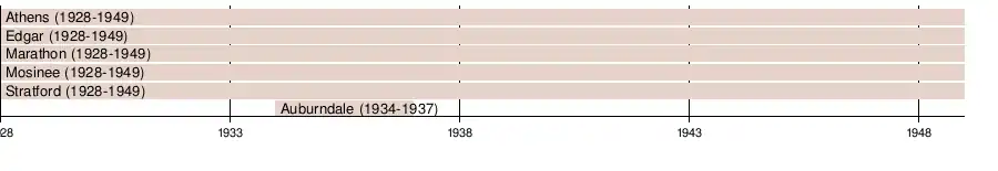 The Marathon County League, alternatively known as the Marathon County Athletic Association, was formed in 1928 as a basketball conference between five small Marathon County-based high schools in central Wisconsin: Athens, Edgar, Marathon, Mosinee, and Stratford.[1] A sixth school was added in 1934 when Auburndale moved over from the neighboring Wood County League,[2][3] and despite their location outside of Marathon County, the league did not change its name. Auburndale would leave the Marathon County League three years later before returning to the Wood County League.[4] The conference lasted for just over two decades before four member schools (Athens, Edgar, Marathon and Stratford) joined former Wood County League members Auburndale, Pittsville and Rudolph in 1949 to form the new Marawood Conference.[5] Mosinee, the only school not to participate in the new league, played as an independent before joining the Central Wisconsin Conference in 1950[6] and the Lumberjack Conference in 1953.[7]