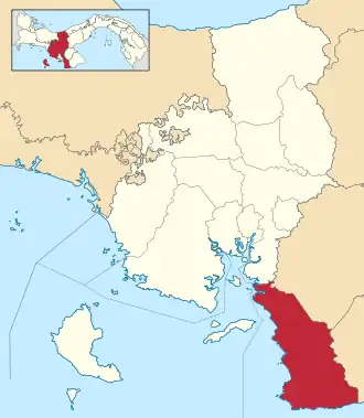 Geographically, the district totaling 1,381 km2 (533 sq mi) comprises the west-facing coast of the Azuero Peninsula fronting the Gulf of Montijo. It shares the peninsula with Los Santos and Herrera Province, separated by a crest of low mountains, the Macizo de Azuero. The highest peak is Cerro Hoya (1,559 m (5,115 ft)) in the far south.[2]