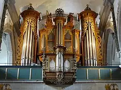 The organ was built during the Thirty Years' War between 1621 and 1624 by the organ-builder Georg Wagner of Lich and had around 20 registers with two manuals and a pedalboard, as well as wing doors on the sides.[34] The instrument was originally located where the Fürstenstuhl now stands. Between 1631 and 1633, the organ was expanded with the two pedal towers of the organ of Arnsburg Abbey which was probably also built by Wagner around 1607. These were brought to Lich to protect them from being plundered by Swedish troops. The Lich-based organ firm, Förster & Nicolaus Orgelbau relocated the organ in 1861 from the small gallery in the ambulatory to the west gallery and modified its tuning. The instrument was modified repeatedly by the firm over time. In 1913, a substantial renovation took place in the course of which the organ received tubular-pneumatic action, cone chests, a free-standing console, an expression pedal and several new registers. A further rearrangement followed in 1941 in the course of the organ reform movement. In 1961, the empty rear housing was refilled with new registers in a slider chest. A new organ with mechanical tracker action was installed in the old housing, incorporating the old registers, in 1972. Finally, further tunings were added in 2002, so that the modern instrument contains over 39 registers and can adequately reproduce a broad range of styles.[35]