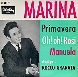 "Marina" is a 1959 Italian song by Italian-Belgian singer-songwriter Rocco Granata, his first international hit and best known song. Originally released in 1959 as the B-side of "Manuela", the B-side became more played than the A-side, and by 30 January "Marina" interrupted "Oh! Carol" by Neil Sedaka for one week at the No.1 spot of Hitkrant's List of European number-one hits of 1960. The song sold millions of copies. It was #1 in Belgium, #31 in the US,[1] and #1 in Germany,[2] The Netherlands, Italy and Norway. It was the #2 jukebox play of the whole year in Automaten-Markt's records after "Seemann" by Lolita.[3][4]