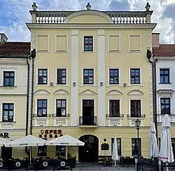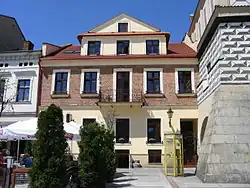 • Tenement at 14 Rynek Street: A two-story tenement with glassed-in arcaded arches. Rebuilt in the 16th century with an arcade and a second floor, it was damaged in the 1735 fire and rebuilt without the arcade by 1796. A second floor was added in 1866, and the arcade and original interior were restored between 1960 and 1962.[29] From 1767 to 1787, it housed Tarnów's first royal post office, commemorated by a plaque. It now contains a restaurant and hotel. It was listed in 1998.[12]