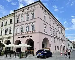 • Tenement at 9 Rynek Street: A two-story tenement with a Baroque-Classical facade topped by a high attic. Built in the mid-18th century after demolishing an earlier structure, it was rebuilt after a 1743 fire. A second story was added before 1800, but the attic was removed in the 1920s. A 1977–1979 renovation restored the attic.[24] A 2015 plaque commemorates Roman Dzieślewski, a pioneer of Polish electrical engineering.[25] It houses local offices of Radio Kraków and TVP Kraków. Listed in 1993.[12]