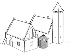 Late Gothic town hall (right, with tower) and adjacent prison, built after 1494