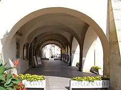 • Rosowska tenement (3 Rynek Street): A two-story tenement with an arcaded porch. Constructed in the 16th century with a vaulted arcade, it replaced an earlier wooden house. Later renovations removed the arcade and altered the second story. A major restoration from 1968 to 1970 reopened the arcade and rebuilt the second story. Since 2013, it has housed the Tarnów Regional Museum.[11] It was listed in the Lesser Poland Voivodeship's register of monuments in 2007.[12]