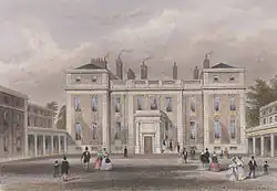 This view of the entrance front published in the 1850s before Pennethorne's additions shows an additional storey on the wings. The wings later gained a fourth main storey, and the central section gained a third.