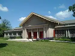 The original plans for Marquette Park called for "a golf course on two islands surrounded by naturalistic lagoons; indoor and outdoor gymnasiums; swimming and wading pools; a children's playground; formal gardens; and a concert grove."[1] Due to its size, construction of the park went more slowly than most of the others in the system, and several features of the original plan were dropped due to difficulties with the landscape. Still, in 1913, the 18-hole golf course opened and "by 1917, the park included playing fields, a children's playground, tennis courts, propagating houses for the nursery, and a large, classically-designed golf shelter."[1][3]