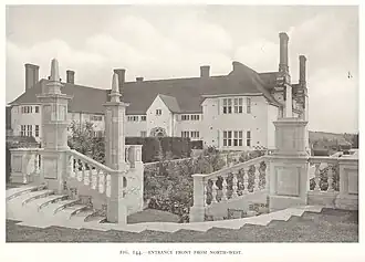 The house was built on the hillside, out of locally quarried chalk cut as ashlar,[5] known as clunch. Lutyens interspersed pieces of black flint and red tiles in the masonry.[6] The exterior design of the house is Tudor, with mullioned and transomed windows,[7] and twisted brick chimneys.[6] "Elizabethan bricks" were supplied by the Daneshill Brick and Tile Company, an enterprise set up by another Lutyens client, Walter Hoare.[8]