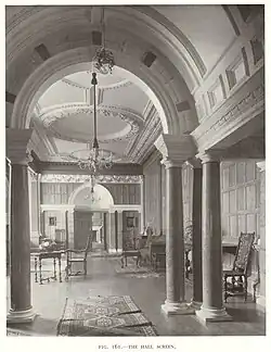 Internally, a long corridor runs east to west, with the main rooms all south-facing.[6] The interior design is neoclassical.[9] The oak-panelled hall features two friezes carved in chalk, with classical festoons. The dining room is panelled in walnut veneer. Ceilings have highly decorative plasterwork.[10] There are chalk fireplaces and even a chalk billiard table.[6] Lutyens also designed the light fittings.[11]