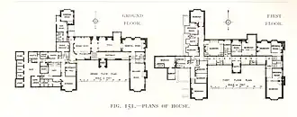 The north, entrance front on the higher ground is two-storey,[1] in an E-plan with the facades displaying predominantly horizontal lines.[7] The south, garden front is taller,[1] less symmetrical, and with emphatic vertical lines.[7] The west end of the south front is dominated by chimney stacks.[6] At the east end of the south front, a wing projects forward, enclosing a service courtyard.[1]