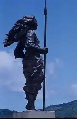 Several monuments have been dedicated to Tiahahu. In Ambon, capital of the province of Maluku, an 8-metre (26 ft) tall statue of her holding a spear was erected in 1977; it stands in Karangpanjang overlooking the Banda Sea.[3] In Abubu, a statue of her leading soldiers while holding a spear was erected and dedicated on the 190th anniversary of her death.[2][3] She also has several items named after her, including a street in Karangpanjang, Ambon, a street (Martha C. Tiahahustraat) in Wierden (Overijssel, Netherlands) and a warship, the KRI Martha Christina Tiahahu.[3]