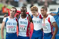 ![]() Mbanjock (centre left) with the victorious 2010 European relay team | |||||||||||||||||||||||||||||||||