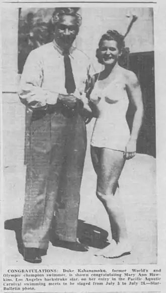 Mary Ann Hawkins was born in Pasadena to a bookkeeper and a collector of dolls.[2] She joined the YMCA and was inspired by one of Duke Kahanamoku's swimming exhibitions when she was around ten. Thereafter she began training and taking part in swimming competitions. She also competed in paddleboarding competitions and was the lone female entrant in the Catalina-to-Hermosa Beach aquaplane race in 1939. She finished in 14th place.[3] When not competing Hawkins worked as a Hollywood movie stunt double and put on performances for hotels in Hawai'i. She also spent thirty years teaching very young children how to swim. Hawkins married four times. She had a daughter Kathy with her first husband Bud Morrissey. She had a son, Rusty, with her second husband, Don McGuire. Though years and thousands of miles apart, both men drowned in boating accidents. Her other husbands were Fred Sears and Jack Midkiff. When she finally retired from the water Hawkins and Midkiff moved to Tucson, Arizona where Hawkins died from cancer in 1993.[2]