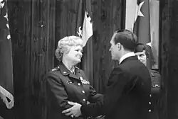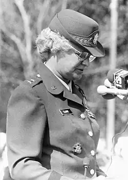 Clarke was at the WAC from 1975 to 1978 as the last executive, as it was dissolved at the end of her administration.[10][11] After this assignment she was given the rank of a two-star general and promoted to major general in November 1978. She then immediately became commander of the United States Army Military Police School and Training Center. During her tenure, in 1979 she oversaw the return of the United States Army Chemical School from the Aberdeen Proving Ground near Edgewood, Maryland to its former home at Fort McClellan by the city of Anniston, Alabama.[12][13] Now with three major missions, a basic Training Brigade, the Army Military Police School and the Army Chemical School, she became commander of the United States Army Military Police and Chemical Schools, Training Center, Fort McClellan, Alabama.[1][7][14] It was the first time a woman commanded a major military installation.[15][16] Clarke was the first woman to achieve the class of major general in the United States Army in 1978.[17][18] In 1980 she was the first woman to complete 35 years of continuous active military service in the United States.[13] She served in the army for a total thirty six years, retiring in 1981.[6][7] This is the longest service ever served for a woman.[1][19]