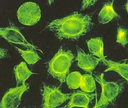 Later, Osborn and Weber pioneered fluorescent antibody staining of cellular substructures, a major technique called indirect immunofluorescence microscopy.[9] In developing the method, they tagged microtubules with specific antibodies, then used fluorescently-tagged secondary antibodies (antibodies to the first set of antibodies) to light up the locations of the microtubules in cells.[10] When they began their work in Germany, the cytoskeleton was not heavily researched. Microtubules and microfilaments were known, and they established that microtubules always reacted with antibodies to tubulins while microfilaments always reacted with antibodies to actin. In the course of their studies, they also found intermediate filaments, slightly thicker than microfilaments, and unreactive to actin antibodies.[7][8]