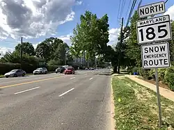 After leaving the town limits of Kensington, MD 185 becomes a six-lane divided highway with partial control of access, passing between residential subdivisions.[1] After crossing a tributary of Rock Creek, the state highway intersects MD 586 at an acute intersection.[2] MD 185 then becomes lined with service roads ahead of and after the intersection with Randolph Road.[2] Beyond Weller Road, the state highway crosses Turkey Branch and then a bridge over Matthew Henson State Park.[2] MD 185 then enters Aspen Hill and intersects Aspen Hill Road within a commercial area.[2] The state highway meets its northern terminus at MD 97 (Georgia Avenue). Connecticut Avenue continues as a county-maintained highway north across Bel Pre Road into Rossmoor, home of the Leisure World retirement community.[2]