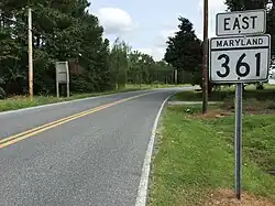Maryland Route 361 (MD 361) is a state highway in the U.S. state of Maryland. Known as Fairmount Road, the state highway runs 5.62 miles (9.04 km) from the beginning of state maintenance in Upper Fairmount east to MD 413 in Westover. MD 361 provides access to the villages of Manokin and Upper Fairmount. The state highway was constructed from the Westover end beginning in 1926. MD 361 was completed west through Upper Fairmount in the early 1930s.