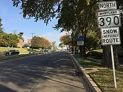 Maryland Route 390 (MD 390) is a state highway in the U.S. state of Maryland. The highway runs 1.09 miles (1.75 km) from 16th Street at the District of Columbia boundary north to MD 97 within Silver Spring. MD 390 is a six-lane divided highway continuation of 16th Street into Maryland and serves as a western bypass of downtown Silver Spring. The portion of the highway south of MD 410 was constructed around 1930. MD 390 was extended north to MD 97 as a divided highway in the late 1950s.