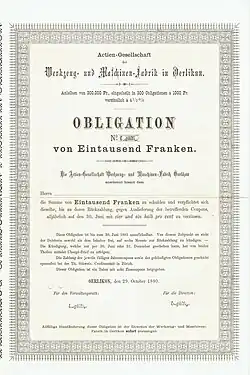 Bond of the Werkzeug- und Maschinen-Fabrik Oerlikon, issued 29. October 1880