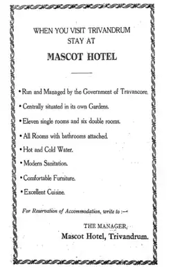 - ^ "Mascot Hotel, Trivandrum (Thiruvananthapuram), Accommodation, KTDC, Premium Heritage Business, Kerala, India". www.ktdc.com. Retrieved 1 December 2017.