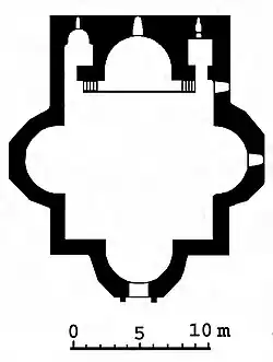 The church was constructed whilst Armenia was part of the Byzantine Empire and thus was forced to follow Byzantine architecture styles.[3] In accordance with its square plan, the four projecting apses, inward-facing circular and outward facing polygonal, offer the requisite supports to hold up the imposing polygonal cupola. The complex church designs are like those in Avan and St. Hripsime Church, Echmiadzin. The church is believed to have been renovated in the 10th century but this did not change the domed structure.[4] The church has a number of 7th century AD religious paintings on its walls. The art had been plastered over with plain walls and were not rediscovered until the 21st century.[5]