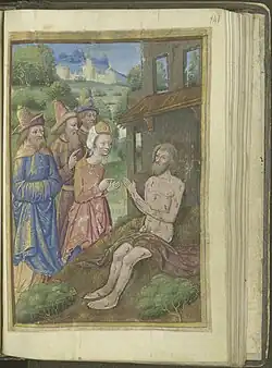 The work is a compilation of episodes from the life of Louis IX and the miracles that took place at his tomb after his death, written by an anonymous author. It was commissioned by Charles II de Bourbon, cardinal and archbishop of Lyon around 1480-1482, who saw it as an opportunity to glorify his ancestor. The work was intended for one of the wives of his brother, Duke Jean II de Bourbon, who, according to the date of the manuscript and certain heraldic clues, could be Jeanne de France (1435-1482). This is the most ambitious work illuminated by the anonymous master who gave it its conventional name. It is large in format, on the model of the Grandes Chroniques de France, whereas other hagiographic books are usually smaller. All the chapters of the work are illuminated: the prologue (dedication miniature), the 41 chapters of the king's life (f.7-f.83), then the 75 miracles of the saint (f.84-115v), a chapter on his canonization, and a conclusion, for a total of 122 miniatures, 48 of which are full-page. Here, the master develops an original iconographic program while remaining very close to the text. According to François Avril, slight differences in certain miniatures suggest the intervention of a workshop.[19][20] Saint Louis is depicted in different ways according to his different roles, whether as monarch, husband, father, or Christ-like figure[21].
