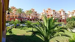 Matalascañas (Spanish pronunciation: [matalas'kaɲas]; local dialect: [matalaʰ'kaɲa]) is the name of an Atlantic beach and coastal town within the Municipality of Almonte, in southwestern Spain.[2] It is known for having an ancient upside down tower on the sand called Torre de la Higuera, one of the seven defensive towers built by Phillip II in the 16th century to protect the coast from incursions by Turkish and North African corsairs and which is protected as a Cultural Interest Asset by the government. This beach is part of the coast of Almonte, which is the longest beach in Spain,[3] being around 30 miles long (53 km) and including several other landmarks like Torre del Loro's Beach, Cuesta Maneli Beach and the virgin beaches of the Doñana National Park, ending at river Guadalquivir. This locale was still called by the tower's name until the 1970s. Matalascañas is surrounded by the Doñana National Park and was segregated from it in 1969 to allow the development of a beach-side tourist village. The mild Mediterranean climate, fine golden sand of the beachfront, mobile dunes and clean water attract tourists throughout the year and the summer nightlife is attractive to young people. Officially established in 1972, its population goes into orbit during the summer, due to its proximity to Seville and being a holiday destination for neighbouring towns and a final residence for retired people. It's been holding the title of Blue flag beach for decades.[4]