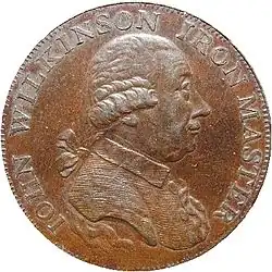 Boulton had turned his attention to coinage in the mid-1780s; they were just another small metal product like those he manufactured.[72] He also had shares in several Cornish copper mines, and had a large personal stock of copper, purchased when the mines were unable to dispose of it elsewhere.[76] However, when orders for counterfeit money were sent to him, he refused them: "I will do anything, short of being a common informer against particular persons, to stop the malpractices of the Birmingham coiners."[48] In 1788 he established the Soho Mint as part of his industrial plant. The mint included eight steam-driven presses, each striking between 70 and 84 coins per minute. The firm had little immediate success getting a licence to strike British coins, but was soon engaged in striking coins for the British East India Company for use in India.[72]