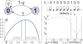 Left: choosing the optimal probability after symbol 0 in Fibonacci coding. Right: a one-dimensional defected lattice and its stationary density for a length-1000 cycle (it has three defects). In a standard random walk, the stationary density is proportional to degree of a vertex, leading to 3/2 difference here; however, in MERW, the density is nearly completely localized in the largest defect-free region, analogous to the ground state predicted by quantum mechanics.