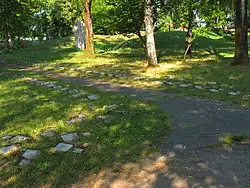 53. ^ Hadžimuhamedović, Amra (2003). "Šušnjar Memorial Complex, the architectural ensemble". Bosnia and Herzegovina Commission to Preserve National Monuments. Archived from the original on 14 July 2014. Retrieved 6 June 2014. First to be buried on the site of the present day Memorial complex were the bodies of 27 civilians of Serbian nationality shot by the Germans on 8 May 1941. On Đurđevdan (St George's Day), when many Orthodox Serb families celebrate the saint's day, there was an insurrection by the Orthodox inhabitants of the village of Kijevo and other settlements around Sanski Most in protest at being prevented by the NDH (Independent State of Croatia) authorities of the day from celebrating the festival. To quell the uprising, German army troops were sent to the area from Prijedor, who set up two cannon in the village of Čaplje and then opened fire on the rebel villages, routing the Orthodox inhabitants. In retaliation for the casualties they had suffered in this encounter, the German army arrested 27 Serbs, took them to Sanski Most and shot them by the Mašinski bridge, as an example to the rest of the population. After they were shot, the bodies were loaded on a horse-drawn cart and driven through the town before being removed from the cart and hanged in the town park. Three days later they were removed to a site opposite the existing Orthodox burial ground in Šušnjar, where they were buried. Prior to this event, all the Jews of Sanski Most had been deported to the Jasenovac concentration camp, where they were killed.