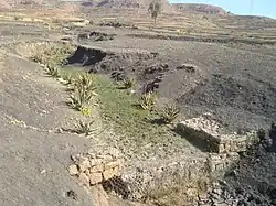 At Gemgema, May Be'ati and on other steep slopes, exclosures have been established; the dense vegetation largely contributes to enhanced infiltration, less flooding and better baseflow.[3] Physical conservation structures such as stone bunds[4][5] and check dams also intercept runoff.[6][7] In the May Be'ati exclosure, more than 1000 precise measurements were done in 2003 and 2004, using 15 runoff plots, where the volume of runoff was measured daily. The rock type (Antalo Limestone), slope gradient and slope aspect were the same, the only difference was the land management and vegetation density. Whereas in degraded rangeland, 35% of the rainfall flows directly away to the river (runoff coefficient), this happens only for 13.4% of the rain in a recent exclosure and 1.7% in an old exclosure. For sake of comparison, the adjacent May Be'ati church forest has a runoff coefficient of only 0.1%.[3]