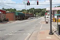McCaysville is located along the northern border of Fannin County and the state of Georgia at 34°58′54″N 84°22′13″W / 34.98167°N 84.37028°W (34.981534, -84.370293).[5]On July 15, 1920, The Georgia senate passed the House bill 672 to incorporate the city of McCaysville. It is bordered to the north by its twin city of Copperhill, Tennessee. The two are situated as a single town along a river, known as the Toccoa River in Georgia and the Ocoee River in Tennessee. The change takes place in the middle of town at the state line, which runs diagonally relative to the street grid, which is aligned with the river rather than the border. The boundary also means that the McCaysville side is in area code 706, while the Copperhill side is in area code 423.